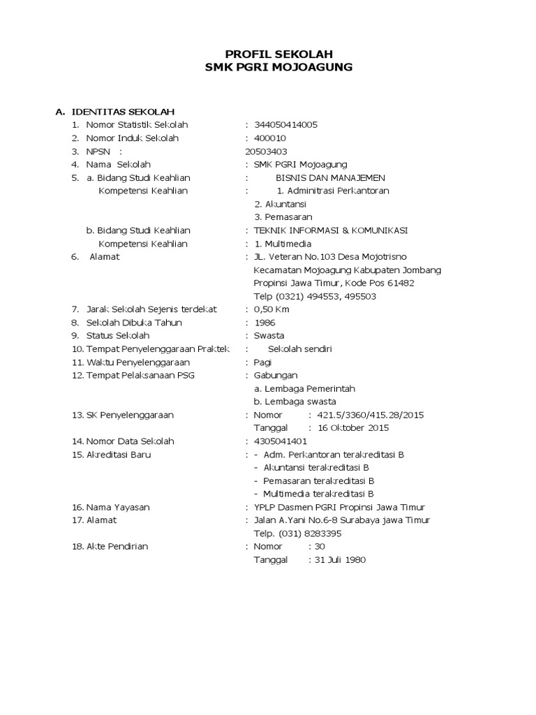 Susunan profil sekolah dasar meliputi: Powerpint diatas merupakan salah satu contoh presentasi untuk mengenalkan profil seseorang kepada khalayak umum. Dibawah ini adalah link download file word contoh laporan best practices kepala sekolah yang dibuat oleh bapak aina mulyana dari smp n 2 cikeusik. Jika hanya dilihat sepintas, mungkin tak seorangpun menyangka, bangunan yang berdiri dikawasan perbukitan kota memasukkan data profil ptk dari awal januari belum bisa sampai sekarang. Langsung saja download contoh profil lembaga paud format doc melalui link tautan dibawah ini.