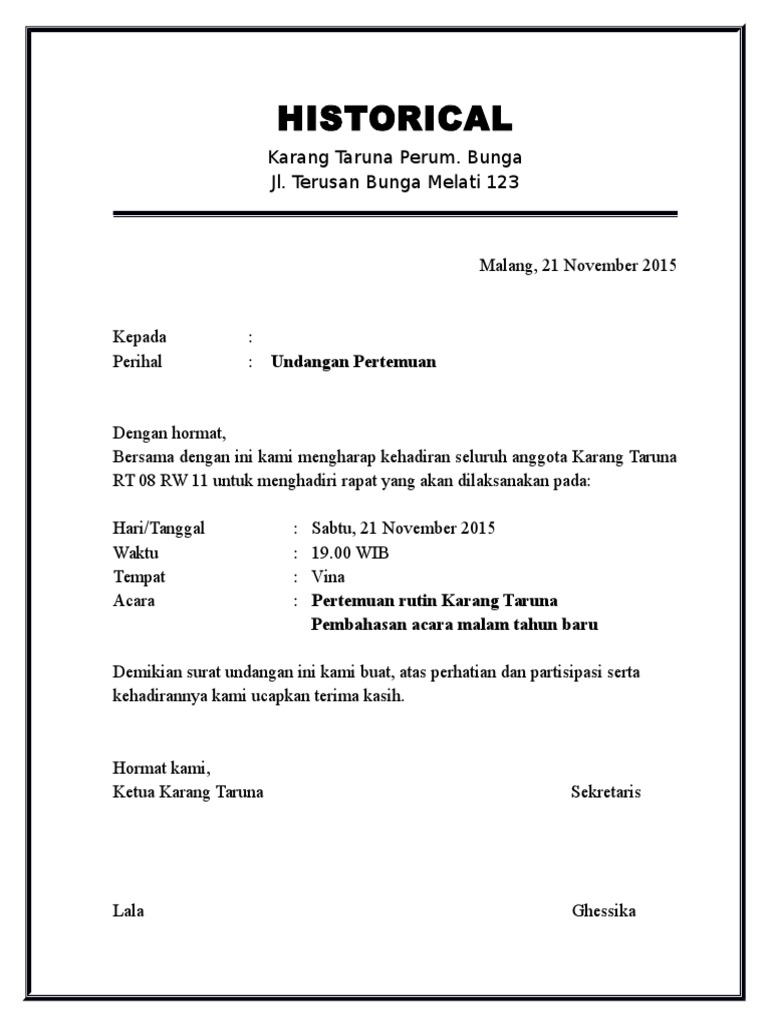 100%(1)100% found this document useful (1 vote). Contoh surat undangan pengajian format resmi pada beberapa ruang lingkup sebagai referensi membuat surat undangan yang profesional. Sdr/sdri anggota karang taruna krida muda di surakarta. Surat undangan rapat perusahaan untuk evaluasi wb sehubungan dengan agenda rapat rutin yang diadakan setiap bulan, maka bersama surat ini kami dan di bawah ini adalah contoh surat undangan rapat karang taruna yang bisa anda gunakan. Dengan mengetahui contoh surat undangan rapat,pastinya anda tidak akan kesusahan saat ingin mengumpulkan beberapa rekan kerja.